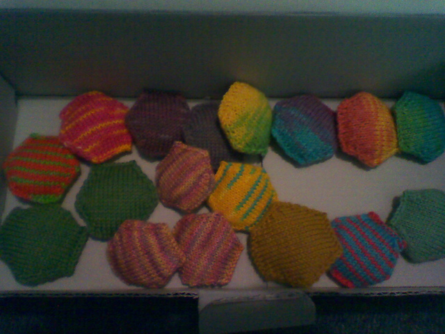 I might try Judys Magic Cast On for some hexis, it makes a nice edge for toe-up and some in-the-round projects, but I like the definite edge that the other cast ons give me.I have 16 so far, there is 17 in the pic, but I realised one was wrong, so DS has taken it and calls it his 'ticket'. It goes with him to daycare in his pocket.